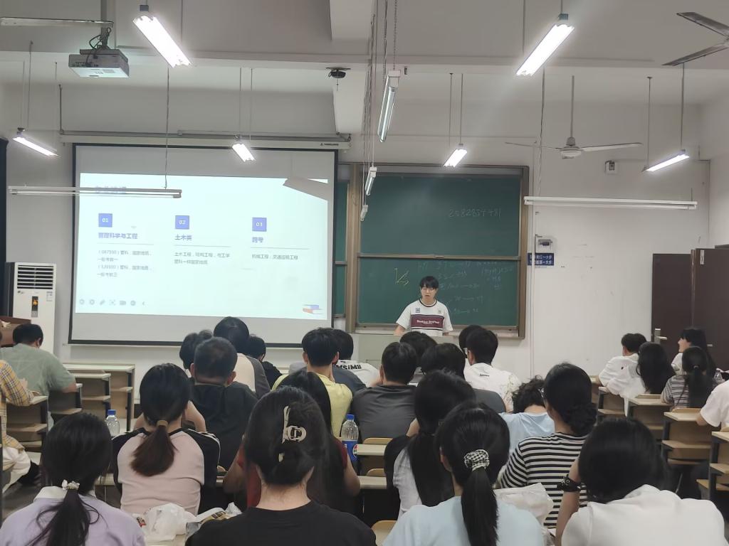活動伊始,2023級輔導(dǎo)員張騰飛簡要介紹了本次活動,強調(diào)了此次活動對于學(xué)生成長的重要意義,鼓勵在場學(xué)生積極提問、主動交流,充分汲取優(yōu)秀經(jīng)驗,為未來的學(xué)業(yè)深造做好準(zhǔn)備。隨后,3位學(xué)長學(xué)姐做經(jīng)驗分享,成功推免至上海大學(xué)結(jié)構(gòu)工程專業(yè)的葉盼盼學(xué)姐分享了自己在保研期間所做的準(zhǔn)備,她強調(diào)除了要保證自身優(yōu)異的專業(yè)成績之外,還需要積極參與科研競賽及社會實踐,不斷提升綜合素質(zhì)。接下來成功考取河北大學(xué)控制工程專業(yè)的姚帥帥學(xué)長和上海理工大學(xué)管理科學(xué)與工程專業(yè)的江振洋學(xué)長則從跨專業(yè)考研的方式、考研院校專業(yè)的選取、院校調(diào)劑等方面為同學(xué)們深入全面講解,同時以自身備考經(jīng)驗,提供合適的備考方案和時間管理方案。在互動問答環(huán)節(jié),同學(xué)們踴躍提問,就跨專業(yè)考研的難度、如何進行高效的復(fù)習(xí)等問題與學(xué)長學(xué)姐們深入交流,學(xué)長學(xué)姐們耐心細(xì)致地解答,并結(jié)合自身經(jīng)歷給出個性化建議,現(xiàn)場不時響起熱烈的掌聲。