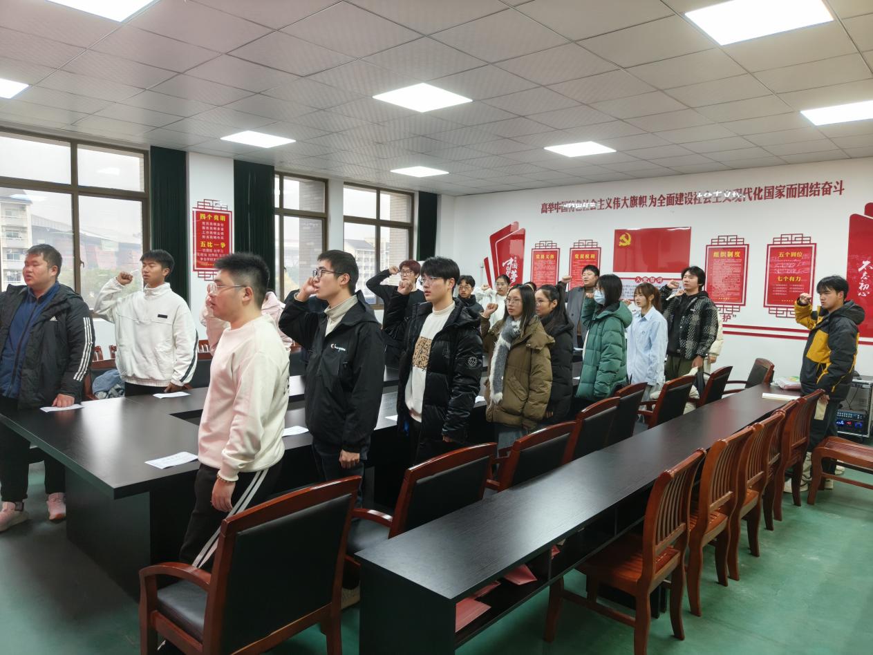 儀式在激昂的中華人民共和國國歌聲中拉開序幕。會上,崔余龍向新團員表示熱烈祝賀并提出希望:希望新發(fā)展的團員同學堅定理想信念,錘煉過硬本領(lǐng),弘揚團的精神,做新風尚的引領(lǐng)者。隨后,崔余龍帶領(lǐng)全體新團員深入學習黨的二十屆四中全會精神,對全會提出的新概念、新觀點、新論斷進行了講解。會議最后,在張艷冬同學的帶領(lǐng)下,全體新團員集體宣誓。誓言鏗鏘有力,字字千鈞,不僅是新團員對團組織的鄭重承諾,更彰顯了他們立志以青春之力報效國家的堅定決心,激昂的聲音在會議室內(nèi)久久回蕩。
