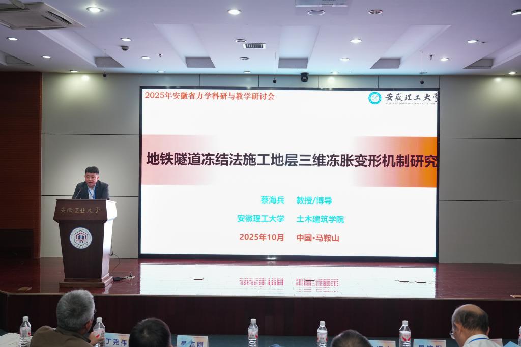 特邀報(bào)告環(huán)節(jié),中國(guó)科學(xué)技術(shù)大學(xué)司廷教授、我校建筑工程學(xué)院院長(zhǎng)于峰教授、安徽省交通規(guī)劃設(shè)計(jì)研究總院股份有限公司總工程師吳志剛、安徽理工大學(xué)蔡海兵教授、合肥工業(yè)大學(xué)孟增教授、安徽建筑大學(xué)徐沛保副教授分別作了《激波管設(shè)備研制與應(yīng)用》《FRP 增強(qiáng)混凝土材料和結(jié)構(gòu)》《馬鞍山長(zhǎng)江公路大橋全壽命周期建造關(guān)鍵技術(shù)創(chuàng)新與應(yīng)用》《地鐵隧道凍結(jié)法施工地層三維凍脹變形機(jī)制研究》《基于物理數(shù)據(jù)驅(qū)動(dòng)的可靠性拓?fù)鋬?yōu)化方法研究》《液晶彈性體人工肌肉及其自主結(jié)構(gòu)設(shè)計(jì)》的報(bào)告。分會(huì)場(chǎng)研討圍繞“計(jì)算力學(xué)及應(yīng)用”“固體力學(xué)及應(yīng)用”“力學(xué)教學(xué)與人才培養(yǎng)”3個(gè)主題展開(kāi)。