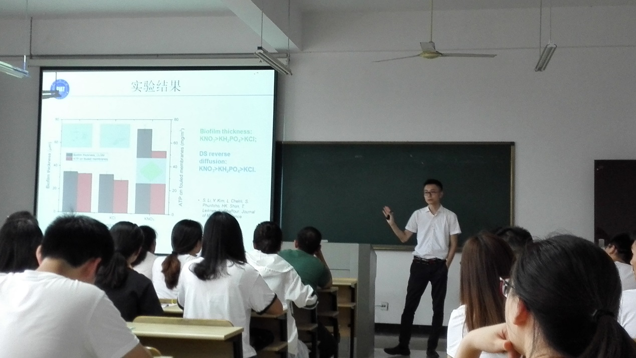 報(bào)告會(huì)上,黎晟首先介紹了正滲透的原理、特點(diǎn)、應(yīng)用、存在的問題以及國(guó)際研究進(jìn)展;隨后詳細(xì)報(bào)告了化肥驅(qū)動(dòng)型正滲透——無土栽培灌溉的小試、中試及應(yīng)用研究工作,探究了化肥驅(qū)動(dòng)型正滲透對(duì)生活污水污染物的去除效果、膜污染物的形成以及膜污染的控制機(jī)理。報(bào)告內(nèi)容豐富,專業(yè)學(xué)術(shù)性強(qiáng),對(duì)我校師生拓寬學(xué)術(shù)思維和學(xué)習(xí)專業(yè)前沿知識(shí)具有積極意義。報(bào)告結(jié)束后,師生積極提問,交流氣氛熱烈。